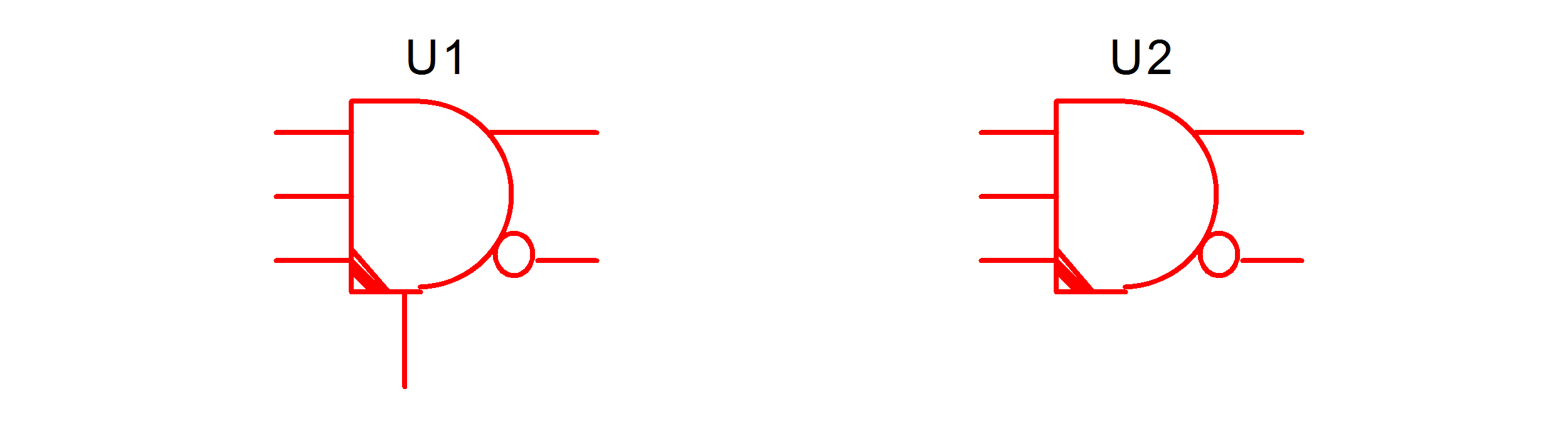 All Advanced Digital components have four slanted stripes in the lower left-hand corner of the symbol. For example, a 3-input AND gate will look like one of the following, where U1 has a ground-reference pin and U2 does not: