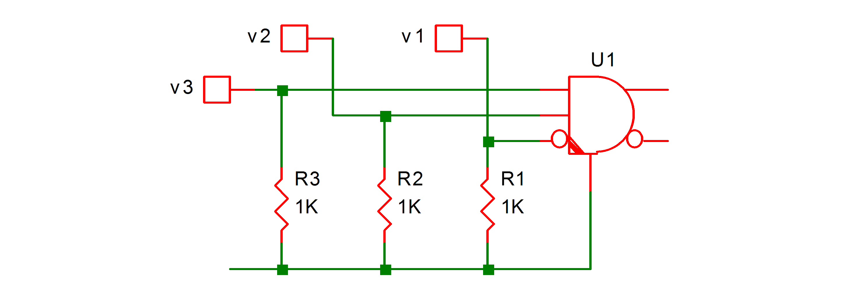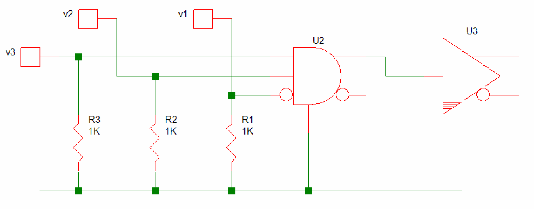 If most or all inputs to a simple logic gate are required to be connected to classic components, the simulation will run faster if a classic digital component is used as a front-end to drive a buffer from the Advanced Digital component library. For example, if all inputs to a three-input AND-gate are connected to classic analog components, a valid option is to have an Advanced Digital 3-input AND gate to sense the three analog inputs directly: