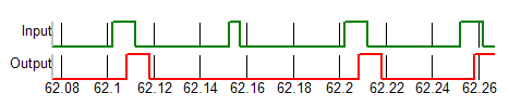 Any Input to Output delay for the new Advanced Digital components incorporates inertial delay where, if the pulse width of the incoming signal is less than the Input to Output delay of a particular device, then there is no resulting change in the output. In the example below, one of the input pulses is narrower than the input-to-output delay of a buffer logic gate. In that instance, the output of the buffer gate effectively "ignores" that one input pulse.