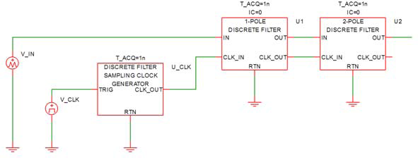 If the time of acquisition is ???MATH???\text{t}_{\text{ACQ}}???MATH???, then the "Sampling Clock Generator for Discrete Filters" will generate a pulse whose pulse width is equal to ???MATH???\text{t}_{\text{ACQ}}???MATH??? every time its "TRIG" input makes a positive transition exceeding 3V. During this pulse, the discrete filter will sample the input data at the "IN" input pin and it will take ???MATH???\text{t}_{\text{ACQ}}???MATH??? for it to satisfactorily acquire the input data. After ???MATH???\text{t}_{\text{ACQ}}???MATH??? has expired, the discrete filter will update its output, and the output will settle within a time duration less than or equal to ???MATH???\text{t}_{\text{ACQ}}???MATH???. In addition, during this duration when the output is updated, the output "CLK_OUT" is raised to a high value.