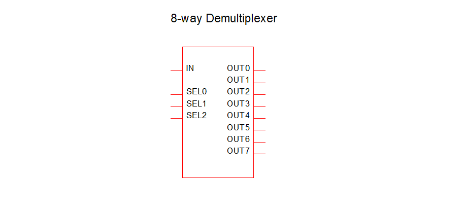 Device is a de-multiplexer or data selector. Each of the output bits is set to a fixed state determined by the output_off_state parameter except the selected output which follows the input. The selected output is controlled by the selector input. If 0, output bit 0 is selected, if 1 bit 1 is selected and so on. If the selector has a value larger than the number of output, all outputs will be set to the value determined by the output_off_state parameter.