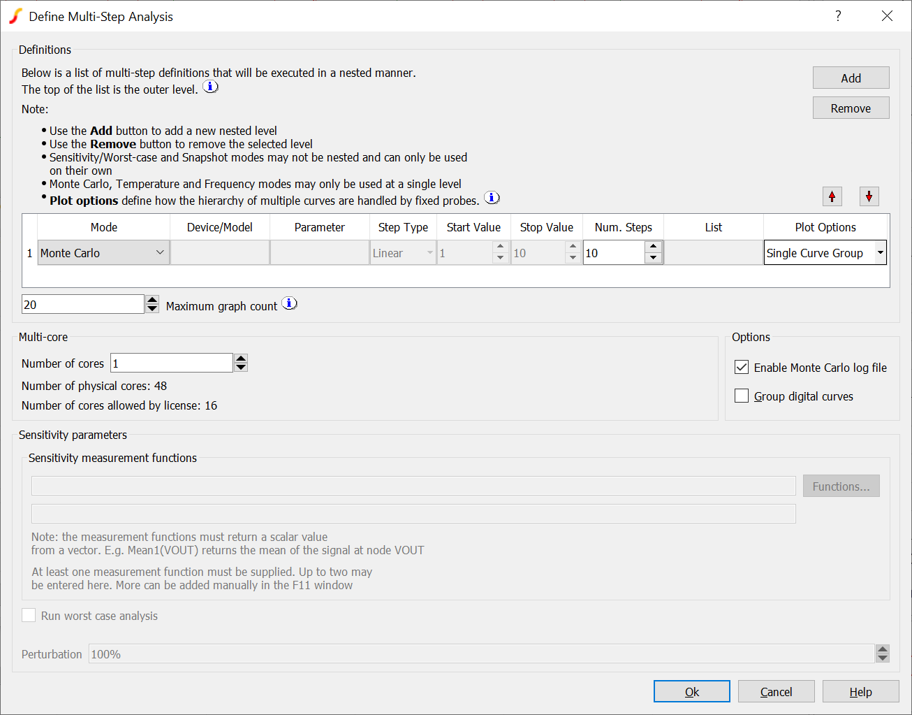 3. In the Monte Carlo and Multi-step Analysis section, check the Enable multi-step box then press the Define... button. This will open:-
