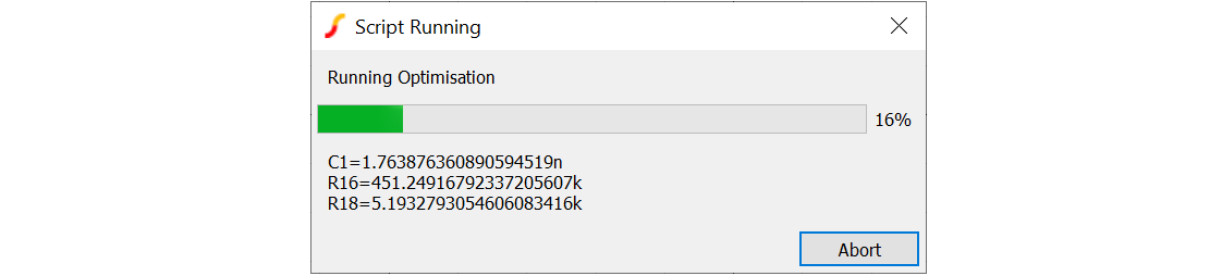 The optimiser can be stopped by clicking on the Abort button. As in SIMetrix mode, progress messages are shown in the Command shell.