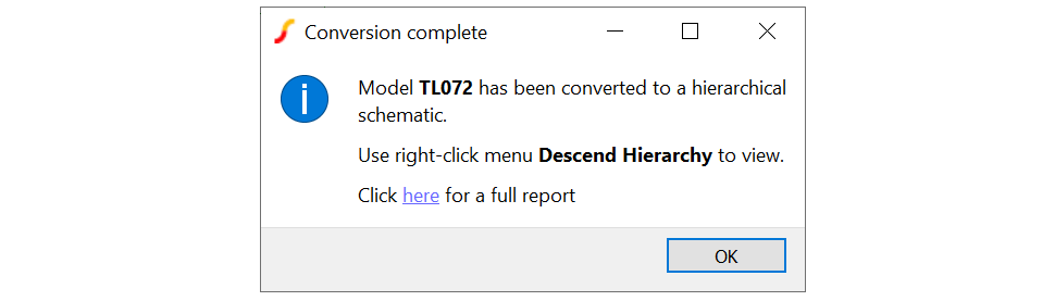 3. If the conversion is successful, the schematic will open automatically. A message box similar to the picture below will also be shown: A report on the conversion process is created and can be opened by clicking the link in the message box. The report lists the schematic files created any files renamed to avoid overwriting. (See details below)