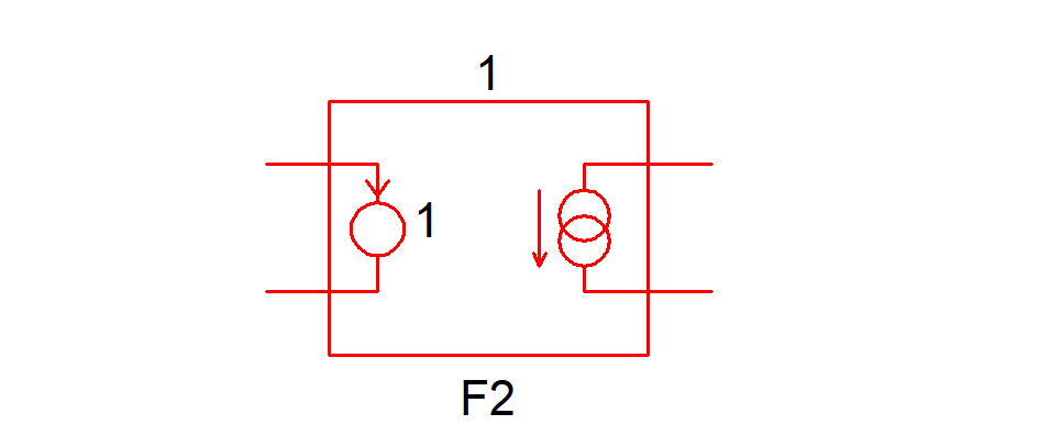 In the above only F1 incorporates the V1 voltage source. F2, whose input is represented by a broken line does not include V1 but references it indirectly. For convenience, F2 is configured so that if the current into its inputs is probed, the plotted value will be the correct V1 current. However this current does not actually flow into the input of F2 but is used by F2 to control its output current. Electrically the circuit as a whole will behave correctly and identically to the original netlist.