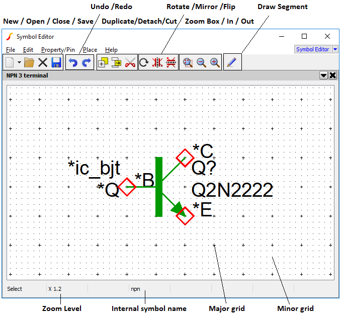 Select the menu File > New > Symbol. This will open a symbol editor window as shown above. Now create the elements of the symbol as described above. Details are provided in the following sections.