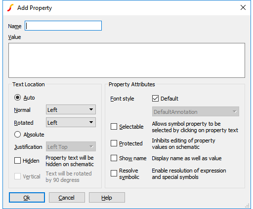 To add a property to a symbol, select Property/Pin > Add Property.... You will see the following dialog box: