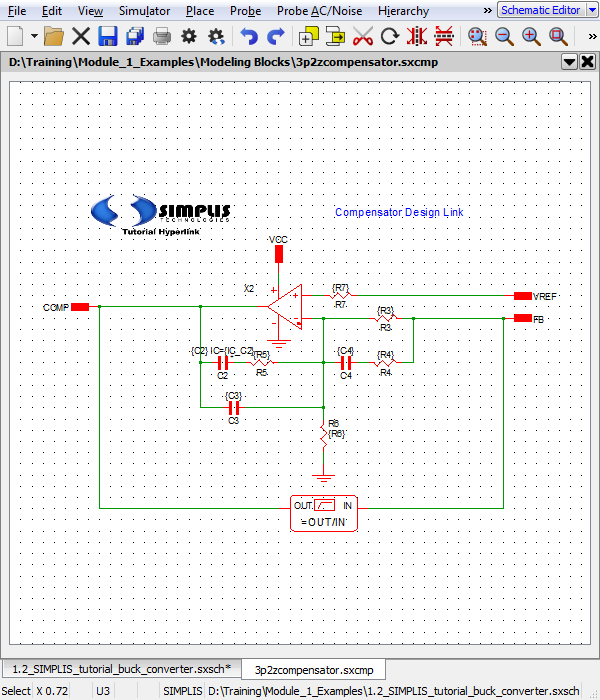 The 1.2_SIMPLIS_tutorial_buck_converter.sxsch schematic contains one model implemented with a Schematic Component file, the compensator U3. To view the schematic for the compensator,