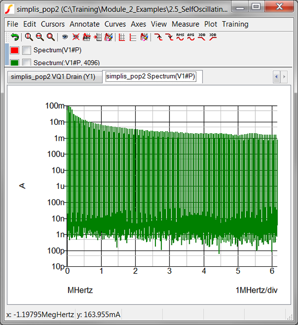 Result: The frequency spectrum for the input current is plotted on a new graph tab. The default settings will calculate the spectrum using the FFT algorithm, and the plot is on a new graph sheet because the X-axis is in Frequency, not time.