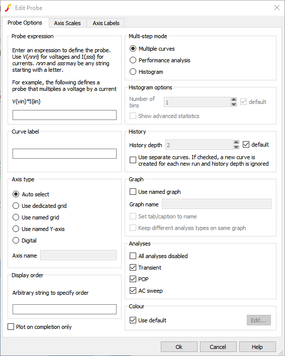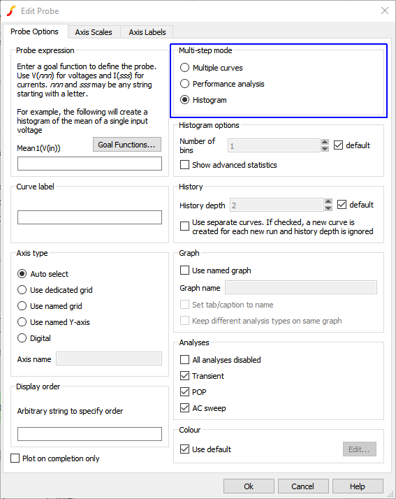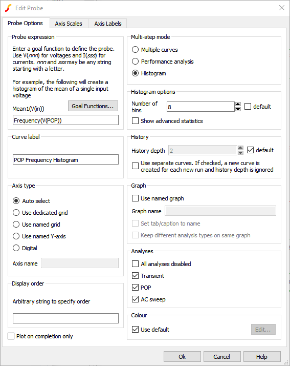 Therefore, every histogram will require a function to operate on the voltage or current, and this function must return a single scalar value for each Monte Carlo step. For the above mentioned example, the function used to return the average value of a voltage or current from a time-domain simulation is Mean1(). For this example you will plot the converter switching frequency using the Frequency() function.