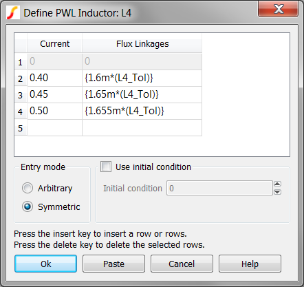 Piecewise Linear Inductors, such as L4 in this example, are implemented with a .MODEL statement, which in this case, starts on line #50. The PWL points are listed as X,Y pairs starting at X0 and Y0. Notice the X values have the same numerical values defined in the dialog. The Y-values are all multiplied by the constant value L4_Tol. The L4_Tol is constant because the value is evaluated once per Monte Carlo run, and from that point onwards, the same constant value is used in the expressions for L4_Tol. The value of L4_Tol will almost certainly be different for the next Monte Carlo simulation step.