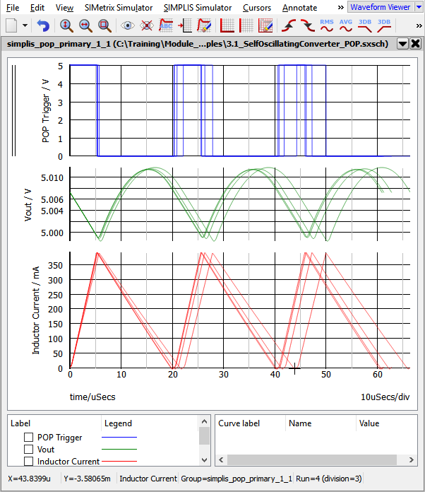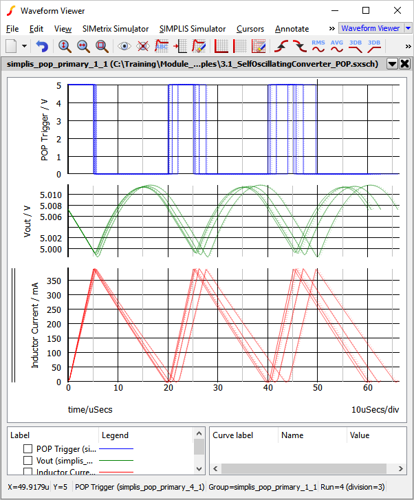 Note the seed value 1988583953 which was used for this run. In this converter, the switching frequency is highly dependent on the inductance value. Not unexpectedly, the evaluated parameter value for the inductance is higher than the default value, which requires longer charging and discharging times, and hence a lower switching frequency results.