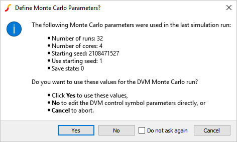Whether it be DVM or non-DVM, any Monte Carlo simulation requires the Monte Carlo configuration file. In the previous example, the configuration file was created using the informattion located in the control symbol. From this point a non-DVM Monte Carlo simulation can be conducted by clicking menu item .