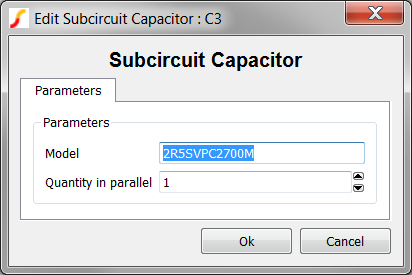 4. Double click on the output Subcircuit Capacitor and enter the subcircuit name in the dialog: 2R5SVPC2700M.