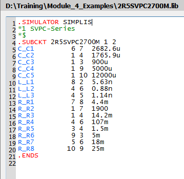 Models in SIMPLIS are typically ASCII text and collected together in model files. These model files can be installed into SIMetrix/SIMPLIS, or the individual model text can be included in the schematic's F11 window. In this topic you will install a subcircuit capacitor model into the library system and verify it works by simulating the design.