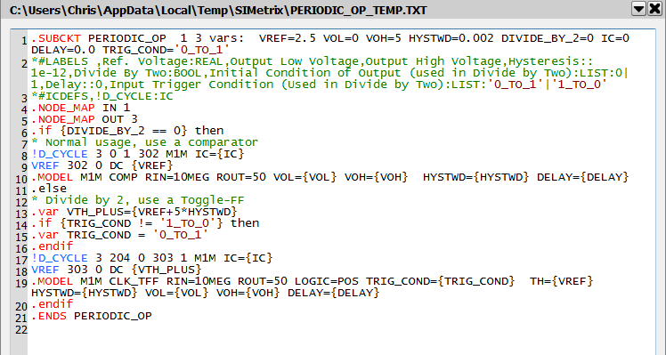 Note: The definition of the PERIODIC_OP subcircuit starts on line 1 with the .SUBCKT statement, and ends on line 21 with the .ENDS statement.