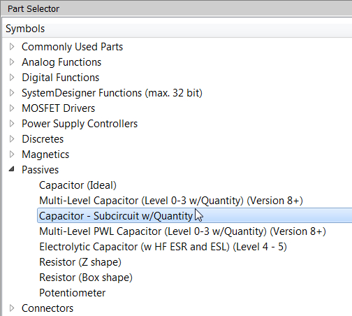 2. From the parts selector, open the Passives category. Select the Capacitor - Subcircuit w/Quantity.