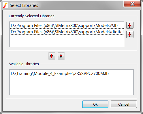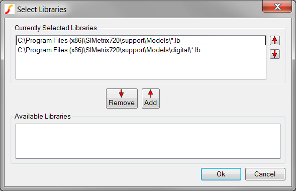 This dialog shows that two "libraries" are installed. Each library path includes the asterisk wildcard character (*), indicating that all files ending with a .lb extension located in the directory are installed. As these two entries include all built-in model libraries, we strongly suggest you not remove either one.