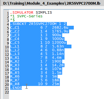 2. Delete the entire subcircuit capacitor model starting at the .SUBCKT statement and ending with the .ENDS statement. You can select the entire text and press Delete.