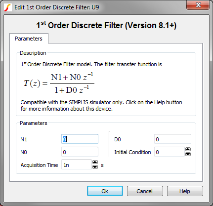 The information in this topic refers to the latest 1st Order Discrete Time Filter which was introduced in version 8.10. In versions prior to 8.10, a similar Discrete Time Filter exists and has the same behavior as the new version. The new version simulates slightly faster than the old version, but the electrical behavior is identical. If you require a discrete time filter for use in versions prior to 8.10, the old 1st Order Discrete Time Filter can be placed from the part selector location: Obsolete > Digital Functions > 1st Order Discrete Time Filter (Obsolete) .
