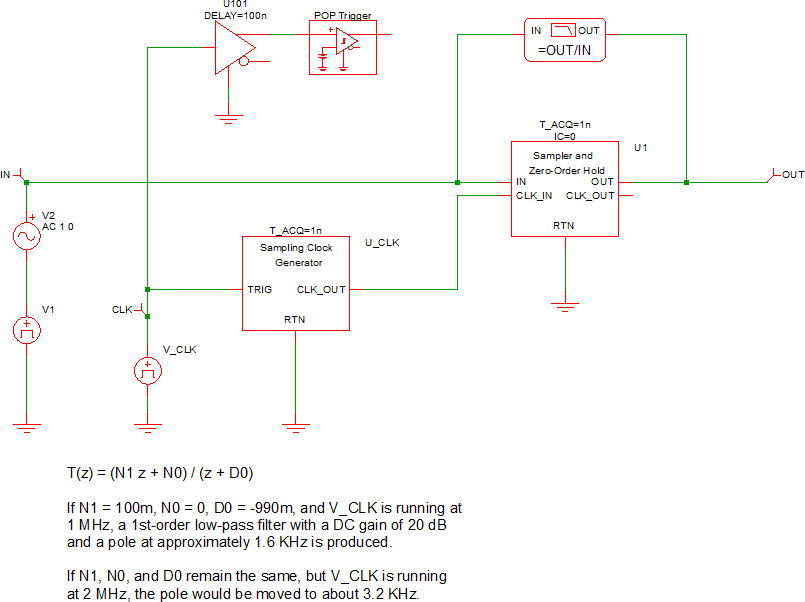The Sampler and Zero-Order Hold models an analog sample and hold. On each clock edge, the input voltage is sampled and held until the next clock edge. As with the other devices in the Discrete Time Filter category, the Sampler and Zero-Order Hold is compatible with the SIMPLIS POP and AC analyses.