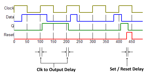 The example below shows an edge-triggered D-type Flip-Flop with asynchronous set and reset. In this example, set and reset are active high. The following diagram shows the definition of the clock-to-output delay as well as the set/reset delay. All Flip-Flop devices have a clock-to-output delay parameter, and all Flip-Flops with the set and reset feature have a set/reset delay.
