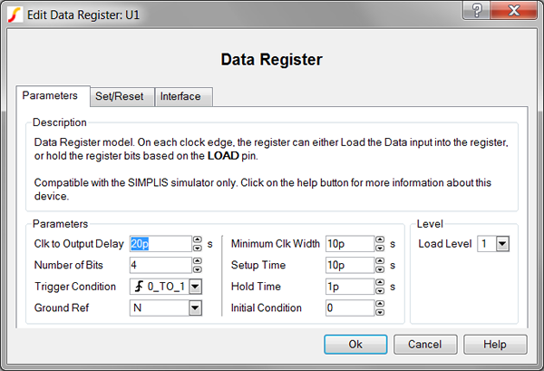 Because the Data Register model is generated by a template script when the simulation is executed, a hand-coded model cannot be inserted into a netlist. The template script for this device is simplis_make_register_model.sxscr, which licensed users can download as part of a zip archive of all built-in scripts.