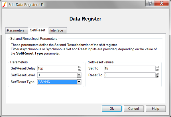 The Data Register models a clocked data register with a load (enable) input. The clock edge for the register can be set with the Trigger Condition parameter to be a rising edge (0_TO_1) or a falling edge (1_TO_0). The set/reset events can be configured to be asynchronous or synchronous to the clock with the Set/Reset Type parameter. The active logic levels of the inputs can be configured with the Set/Reset Level and Load Level parameters.