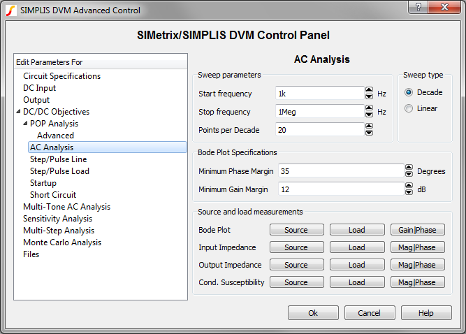 The POP and AC analysis directives are taken from the POP Analysis page and the AC Analysis page of the Full Power Assist DVM control symbol. The AC Analysis page is shown below.