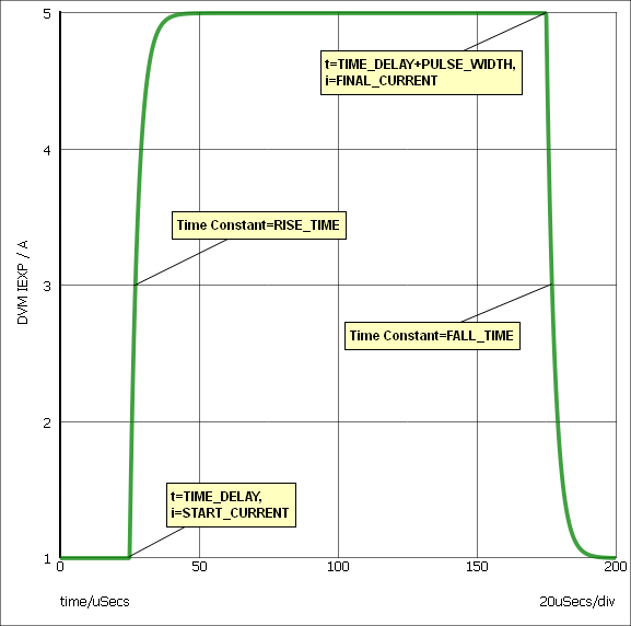 Exp(REF, START_CURRENT, FINAL_CURRENT, TIME_DELAY, RISING_TAU, PULSE_WIDTH, FALLING_TAU) Exp(REF, START_CURRENT, FINAL_CURRENT, TIME_DELAY, RISING_TAU, PULSE_WIDTH, FALLING_TAU, OPTIONAL_PARAMETER_STRING)