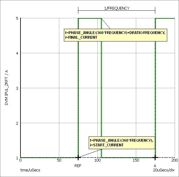 In this example the PHASE_ANGLE parameter is set to 270, and the OFF_UNTIL_DELAY is set to 1; therefore, for simulation times less than the time delay defined by the PHASE_ANGLE parameter, the load current is 1A, which is the value of the START_CURRENT argument.