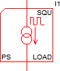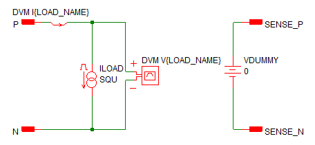 The Square Waveform Load subcircuit models a repeating square wave load current with zero rise and fall times. In DVM, this load is not used in any test objectives, but you can set a load to use this subcircuit with a Squ() call in the Load column of your testplan.