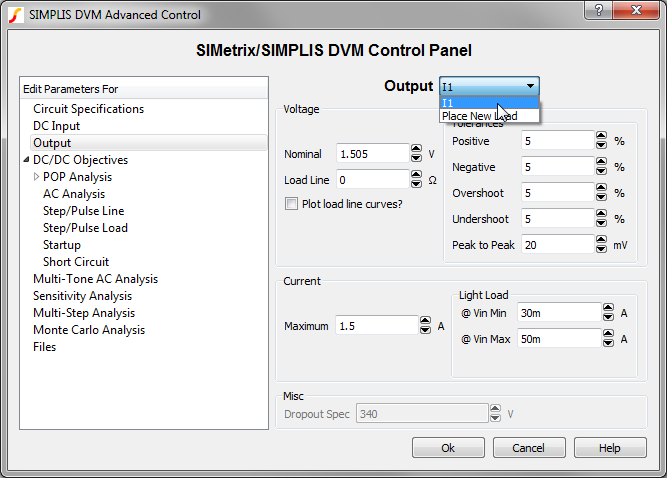 The 3- and 4-terminal DVM output loads have a SENSE (3-terminal) or a differential SENSE (4-terminal) connection. These extra pins allow DVM to include the injected AC perturbation source and Bode plot probe that are required for closed-loop AC analysis. DVM automatically inserts these components into the managed load subcircuit definition for the Bode plot tests. This tutorial illustrates use of the 3-terminal output load.