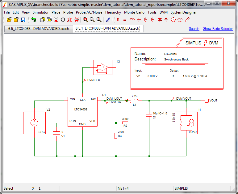 1. Open the schematic from  SIMPLIS_dvm_tutorial_examples.zip at this path: LTC3406B/4.1_LTC3406B - DVM ADVANCED.sxsch.