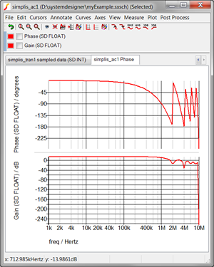 To see the AC analysis results, click on the simplis_ac1 Phase tab:
