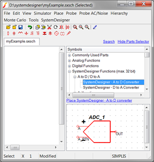 You can use the Parts Selector on the right side of the Schematic editor to place allSystemDesigner components. If the Parts Selector pane is hidden, click the blue Show Parts