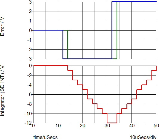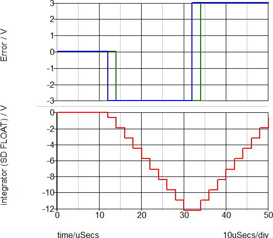Note the quantization of the integrator output in the integer-type simulations: