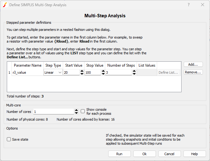 The above example illustrates a linear multi-step parameter run. You can also define a decade (logarithmic) run as well as a list-based run that selects parameter values from a list.