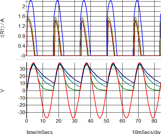 Result: Three simulations are run using the simulation directives setup defined in the Choose Analysis dialog. Each simulation uses a different resistance value for R3. The resistance values are defined as a linear sweep from 20 to 100 with 3 steps. The waveform viewer opens and displays the output curves: