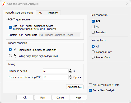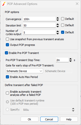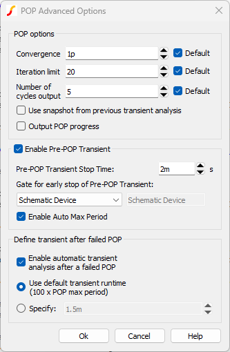 | Define transient after failed POP | If a POP analysis fails to converge, you have the option to automatically start a subsequent transient analysis. This is useful to help diagnose the cause of the POP failure. |