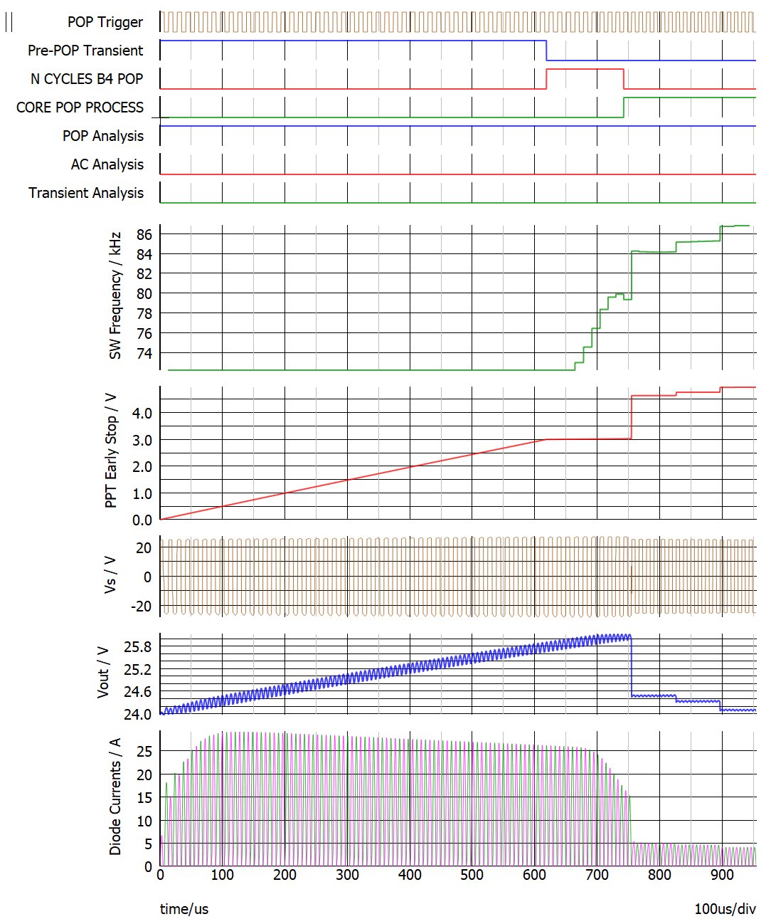 Another purpose of the Pre-POP transient analysis is to address systems, or simulation models, which need to go through a start-up sequence to self-tune some of its parameters against the measured input voltage and possibly load condition. During this start-up sequence, there could be a certain duration of time when the POP trigger may not be able to register any triggering because the system has not entered into a state where it will commence switching. Whereas the POP trigger must be triggered within a certain fixed time duration during the simulation for a fixed number of switching cycles before launching the POP analysis, the Pre-POP transient analysis does not require the POP trigger to be triggered within a prescribed fixed time duration.