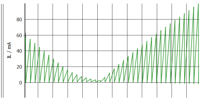 Now zoom in on the inductor current around a zero-crossing. Clearly you can see that the inductor current is a rectified sinusoidal waveform, with higher frequency PWL ripple: