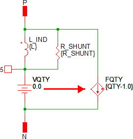 The implementation of the quantity parameter uses a "DC Transformer" technique where the inductor's terminal current is multiplied by a constant using a Current Controlled Current Source (CCCS). This technique effectively divides all resistance and inductance values by the quantity parameter (QTY). This circuitry is added if the USE_QTY parameter is set to 1.