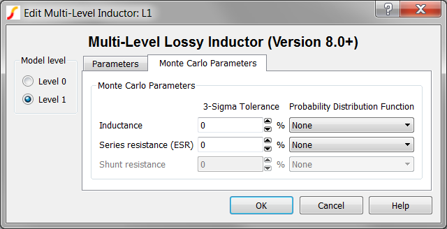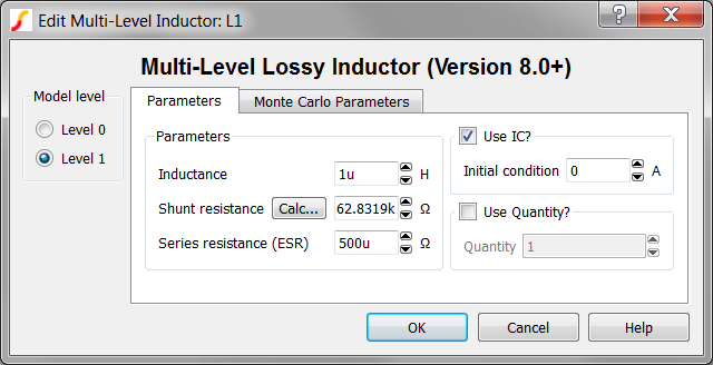 The Multi-Level Lossy Inductor has two levels: 0 and 1. Level zero models an inductor with parallel shunt resistance. Level one adds Equivalent Series Resistance (ESR) to the model. This inductor is available with Version 8.0 or later.