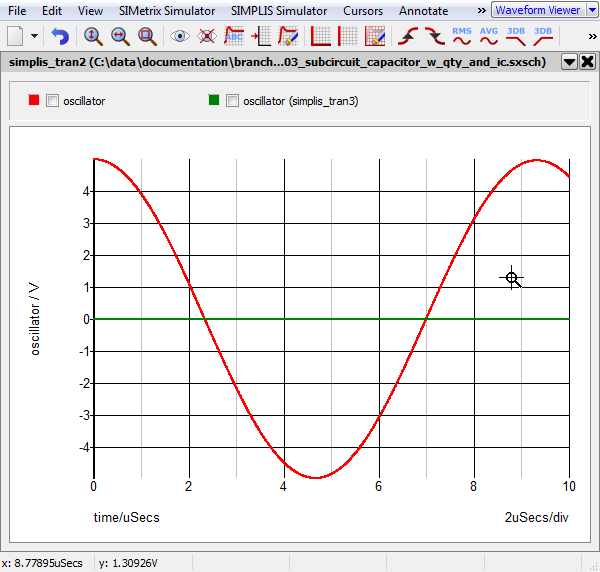The waveforms show below are taken from two simulation runs. In the first run, the initial condition of the capacitor C1 was set to 5V and the USEIC parameter is true. This run (red curve) produces a sine wave oscillation with the initial voltage of 5V. For the second simulation (green curve), the USEIC parameter is false and the oscillator does not oscillate, and the initial condition of the capacitor is an open circuit and the inductor initial condition is 0V.