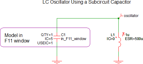 The subcircuit model for the capacitor is stored in the F11 window.