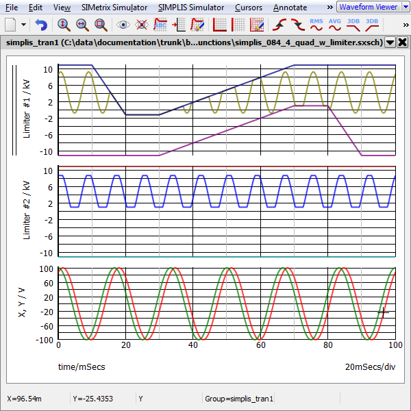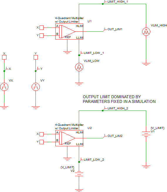 A four quadrant multiplier with limiter example schematic can be downloaded here: simplis_084_4_quad_w_limiter.sxsch. In this example, the amplitude and phase between the two sinusoidal waveform sources is defined in the F11 window with a variable statement. Two multipliers are used to multiply the sinusoidal waveforms - the upper multiplier (U1) output is dominated by the two external sources, VLIM_HIGH and VLIM_LOW. The output of the lower multiplier (U2) is only dependent on the parameter values entered into the multiplier's editing dialog.