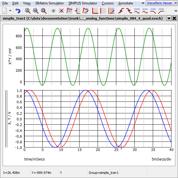 A basic four quadrant multiplier example schematic can be downloaded here: simplis_084_4_quad.sxsch. In this example, the amplitude and phase between the two sine wave sources is defined in the F11 window with a variable statement. The product of the two sine wave sources is output from the 4-quadrant multipler.