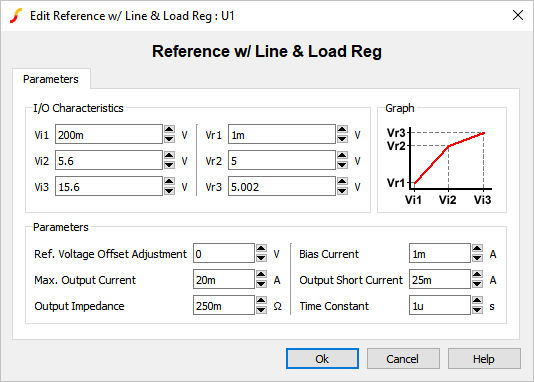 The Parameterized Voltage Reference models a voltage reference with an adjustable maximum output voltage and short circuit current. The model is implemented as a two segment piecewise linear device where the first segment ramps the reference voltage to follow the input voltage and the second segment has a slope near 0 to model the reference voltage in regulation.