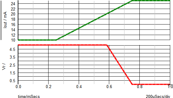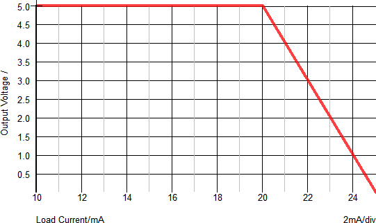 The X-Y plot below helps to visualize the relationship between the reference voltage and the output current. The X-Axis shows the output voltage and the Y-Axis show the load current. You can see that as the load current increases above the Max. Output Current value (20mA), the reference voltage will decrease.